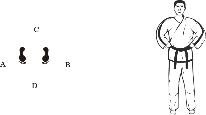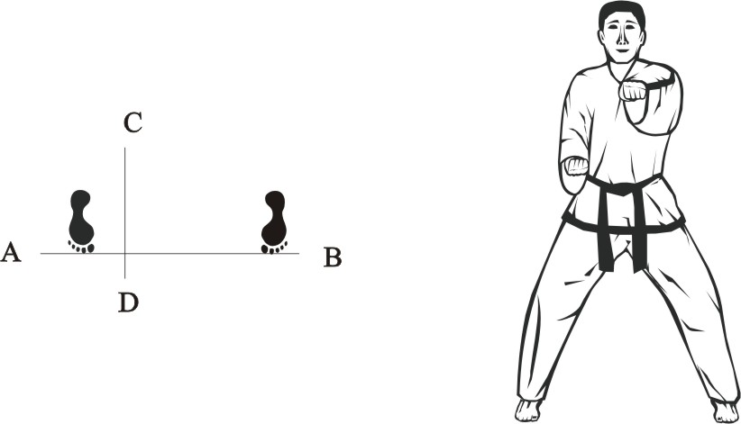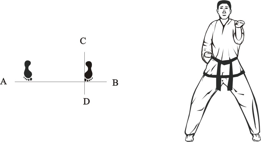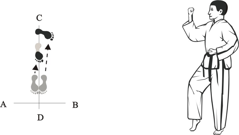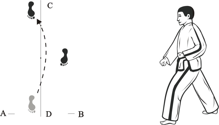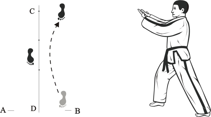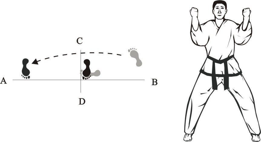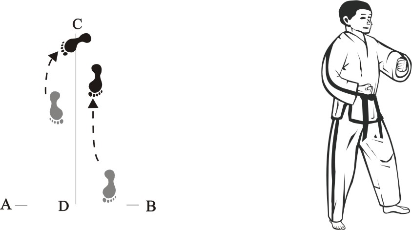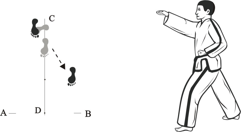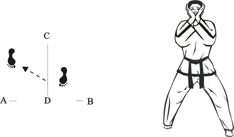 Step forward with the right foot to D, turn to the left and slide with the left foot to D, form a right rearfoot stance towards C and make a right side elbow- punch middle.