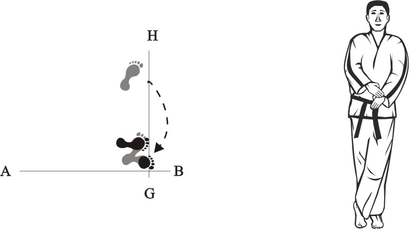 Place the right foot next to the left foot, form a closed stance towards B and assume the ready posture Chumby-G.