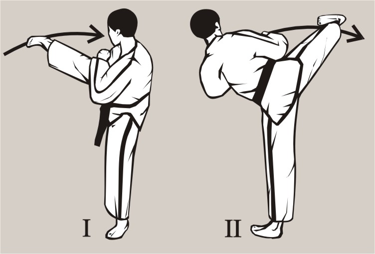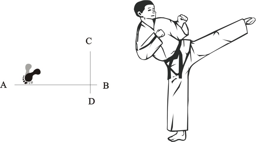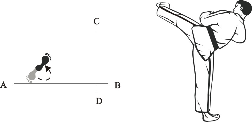 Turn right on the right foot and make a left inward downward-kick high towards B……