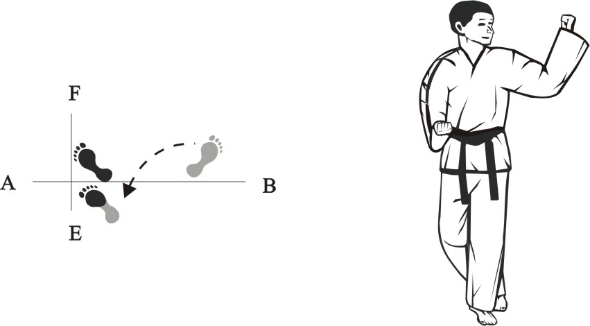 Place the right foot beside the left foot to the side towards E, form a left X-stance towards A and make a right inward inner knifehand-block low.