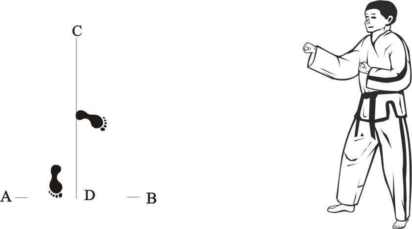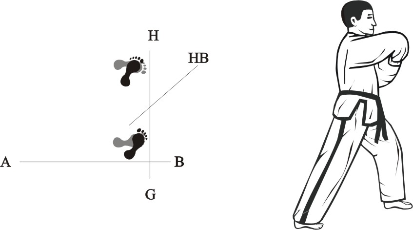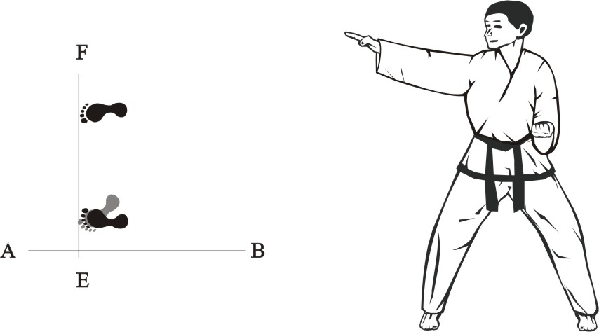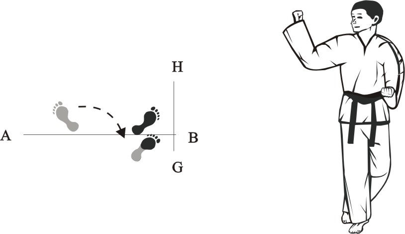 ….. place the left foot forward to B, form a right rearfoot stance towards B and make a forearm guarding-block middle.