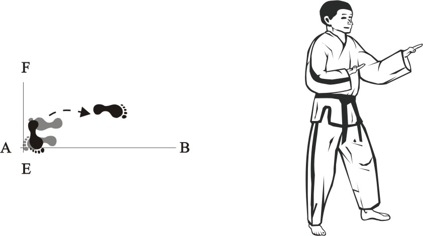 Turn right on the left foot and stamp the right foot sideways to F, forming a sitting stance towards A and make a right side knifehand-strike high.