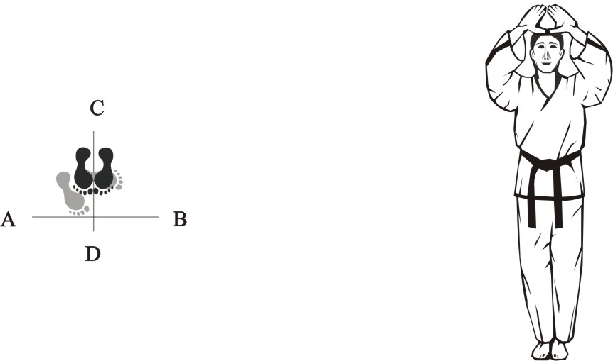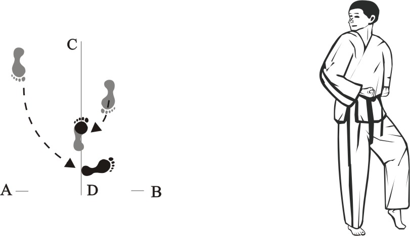 Turn right on the left foot and bring the right foot next to the left foot, forming a closed stance towards D and assume the ready positure Chumby-E.