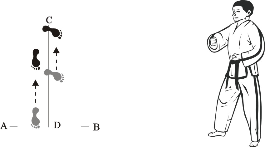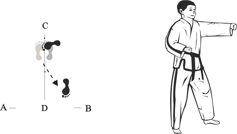 Step back with the right foot towards C, form a left walking stance towards D and make a right fist-punch downward.