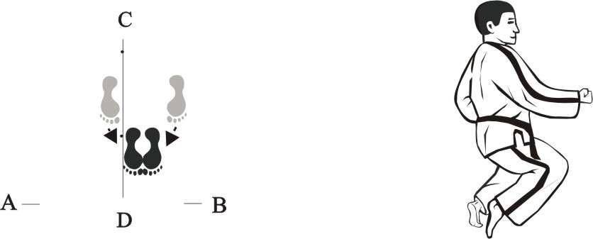 Jump upwards and turn to the right, make a right jumping clockwise turned heel-kick middle towards D……