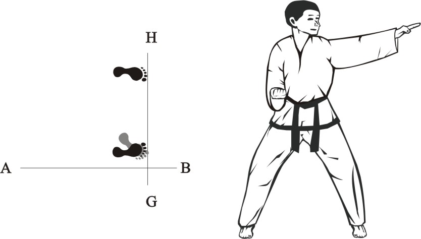 Stamp the left foot sideways to H, form a sitting stance towards B and make a left side knifehand-strike high.