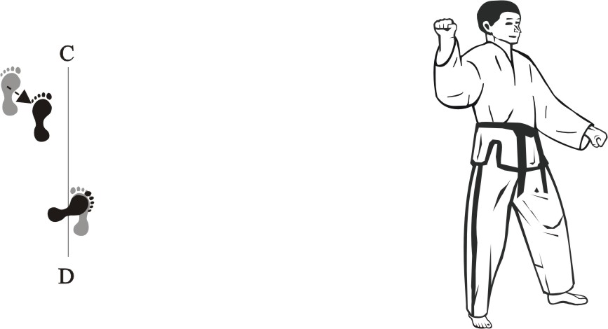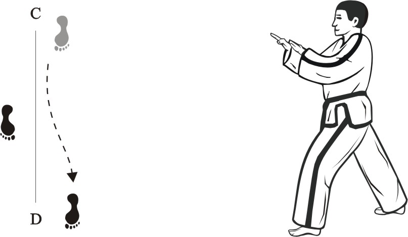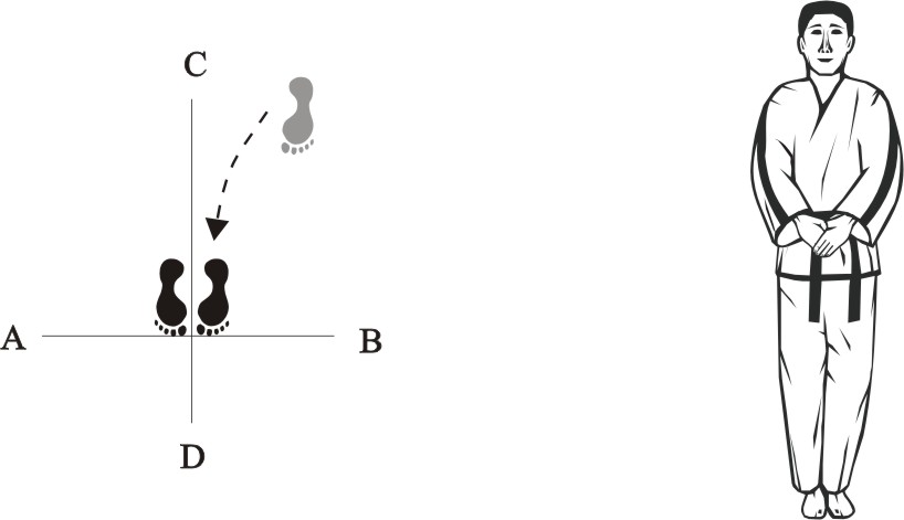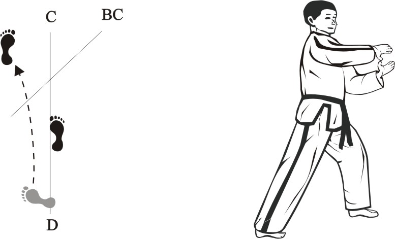 Place the left foot next to the right foot, form a closed stance towards D, and assume the ready posture Chumby-C.