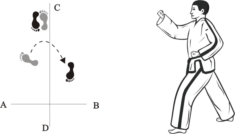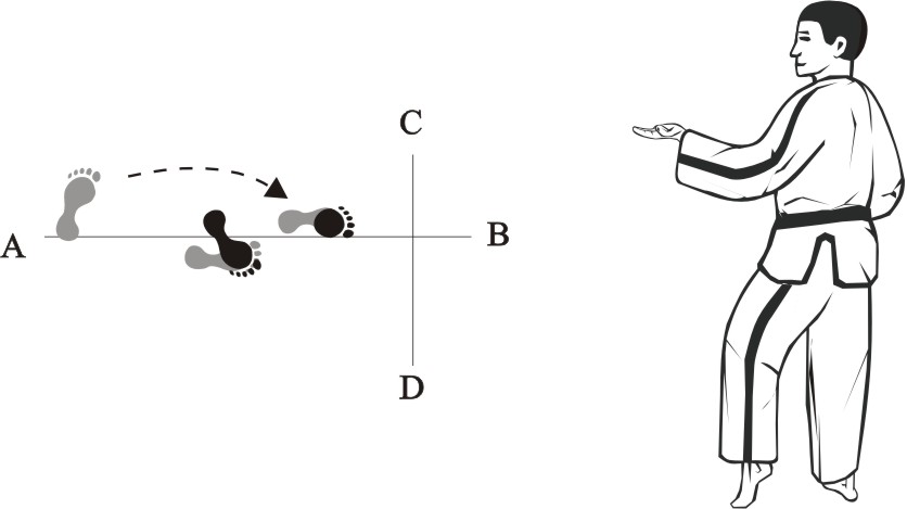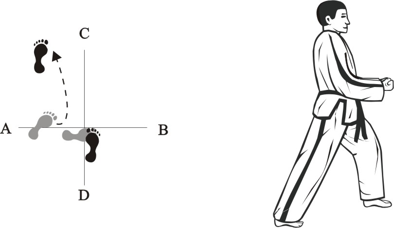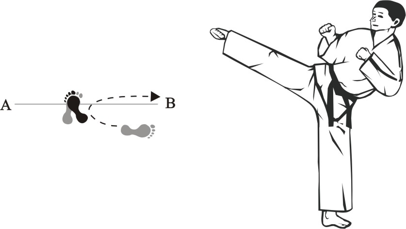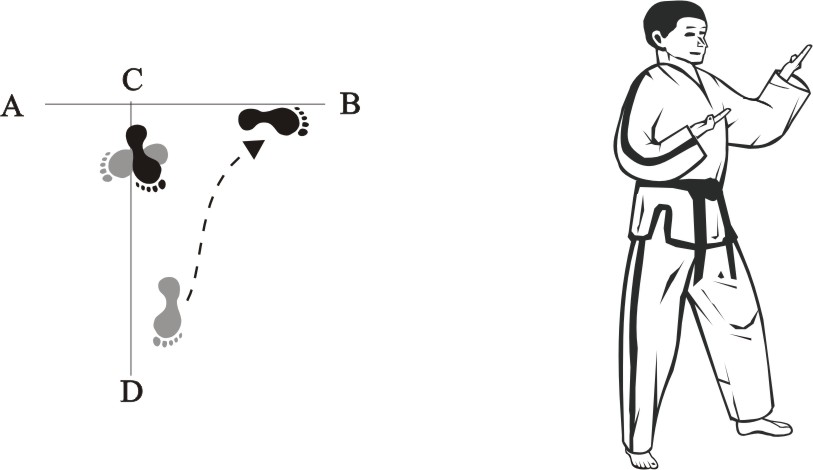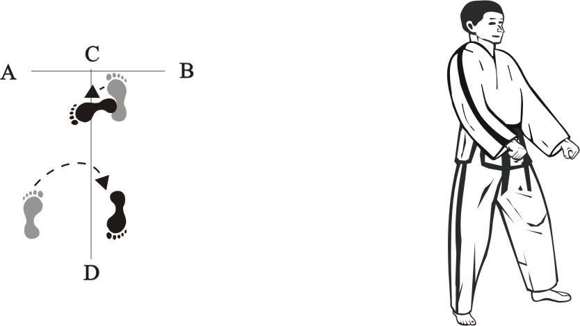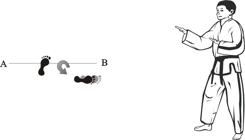 Turn left on the left foot and make a right inward sweeping-kick downward towards B…..