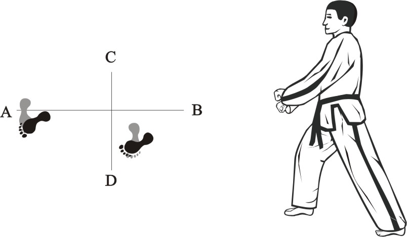 Step with the right foot to the side towards C and place the left foot backward, form a sitting stance towards B and make an innner knife hand wedge-block middle.
