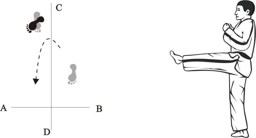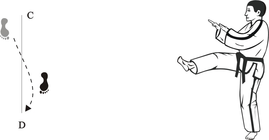 Turn right on the right foot and make a left front-kick low towards D.