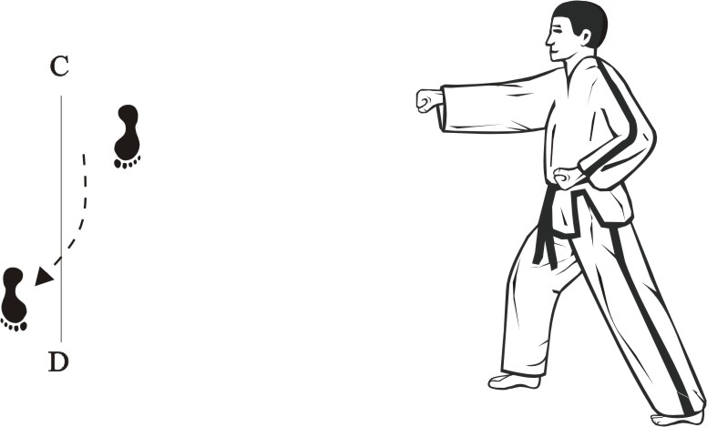 Step the right foot forward towards D, form a right walking stance towards D and make a right fist-punch middle.