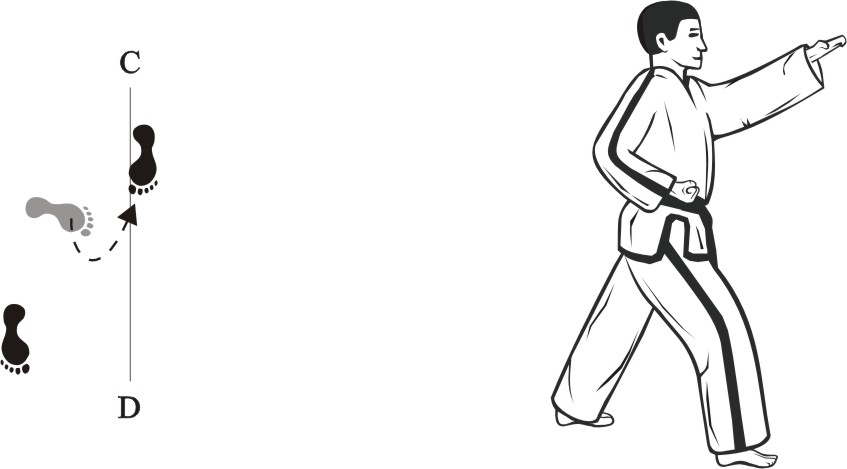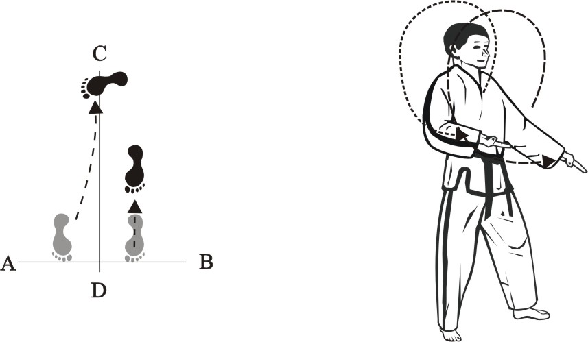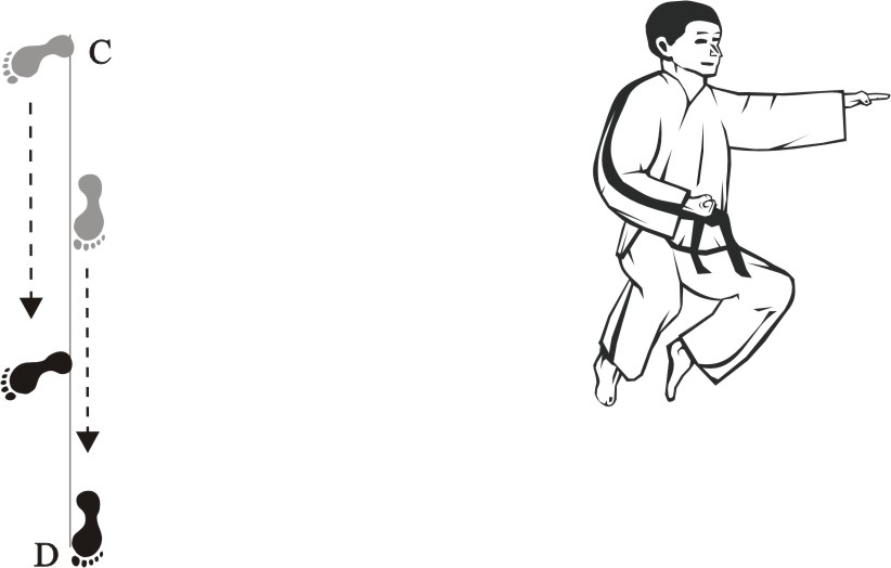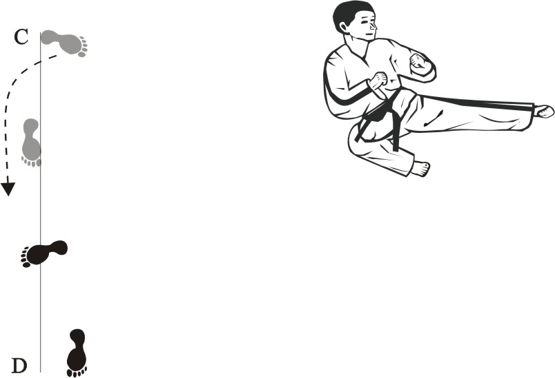 Jump up and forward towards D and make a left jumping outer knifehand-strike middle …
