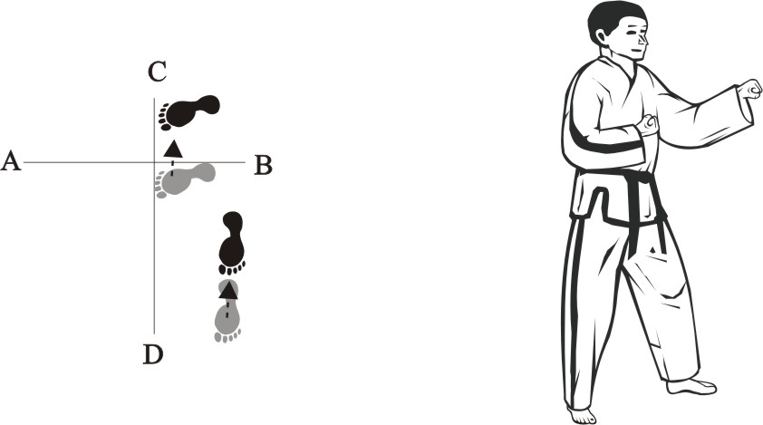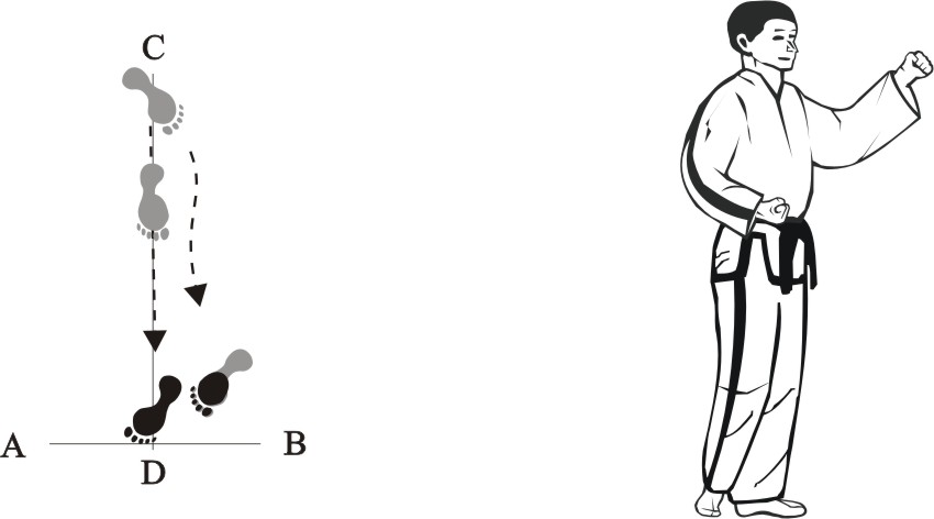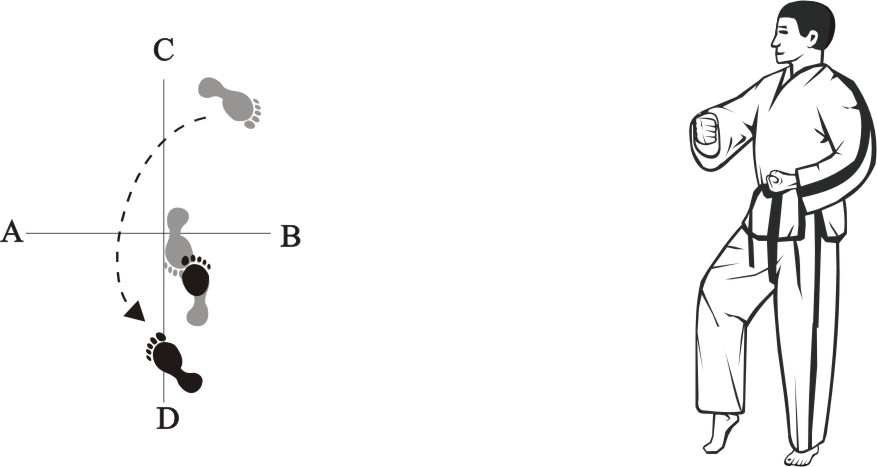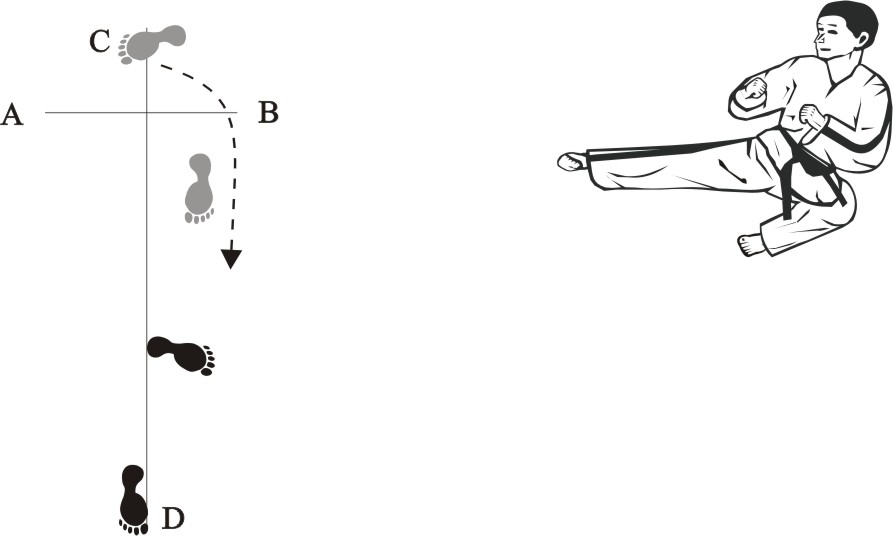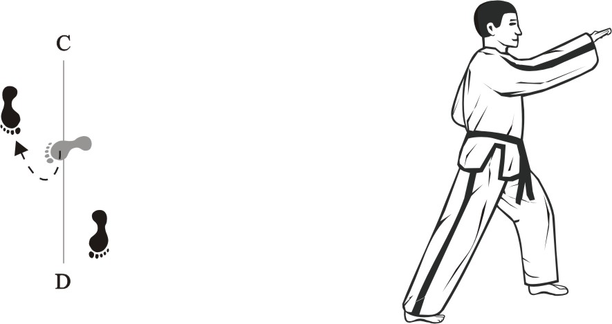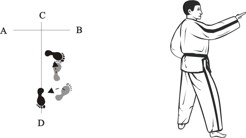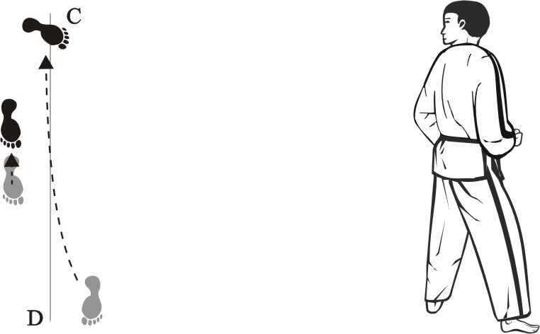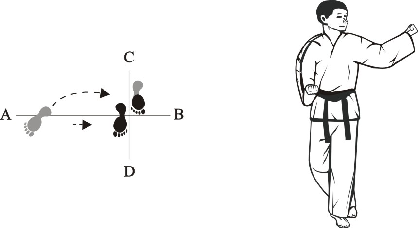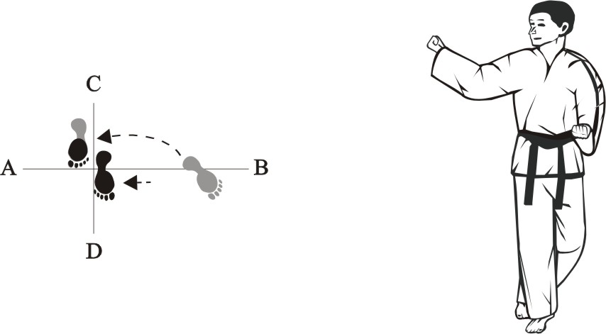 Jump aside towards B, form a right jumping X-stance towards D and make a left sideward downward backfist-strike middle.