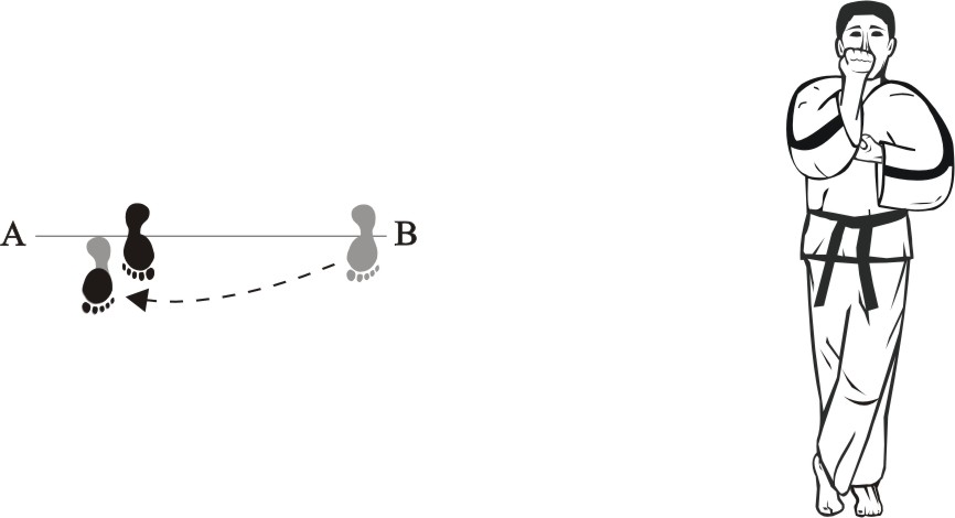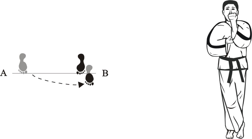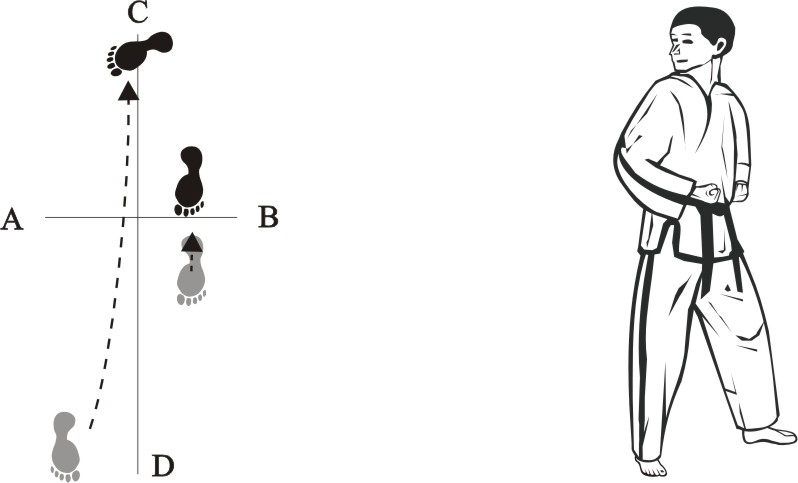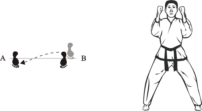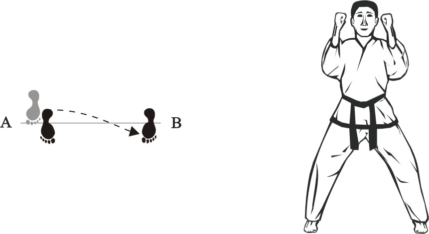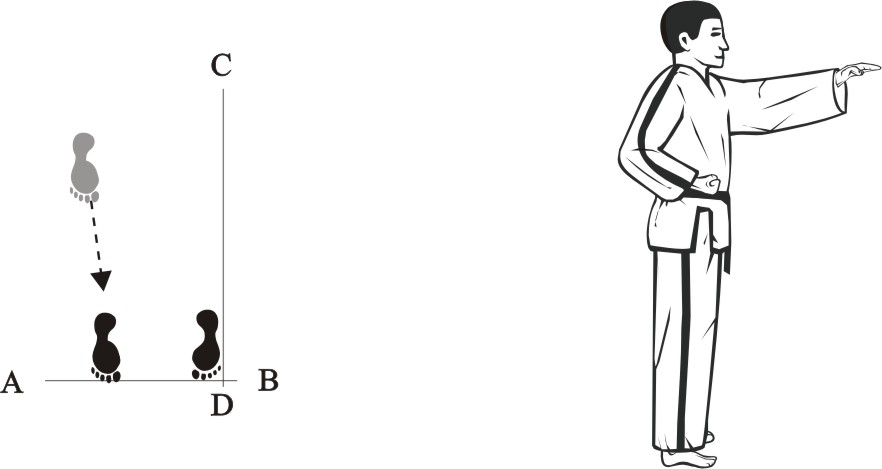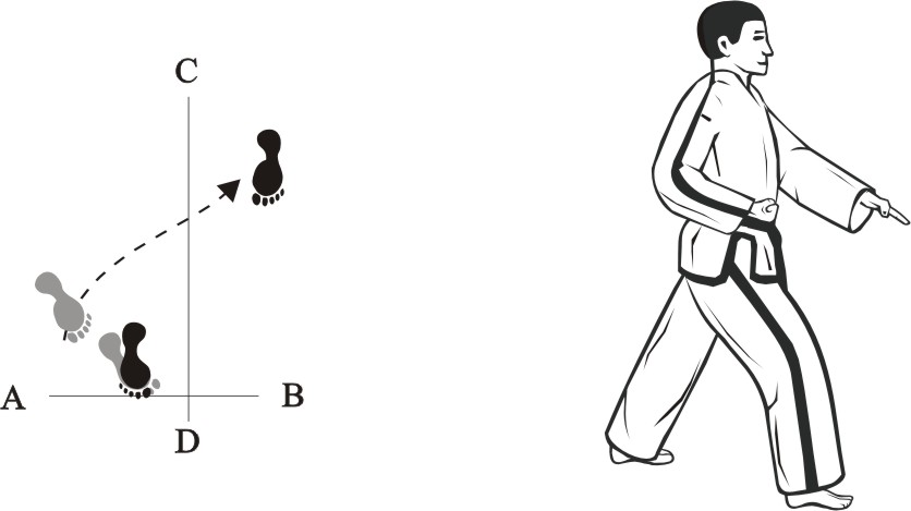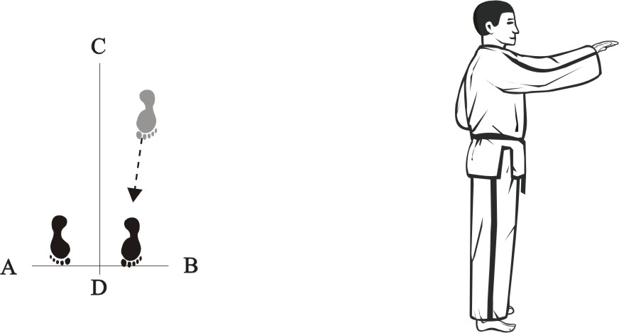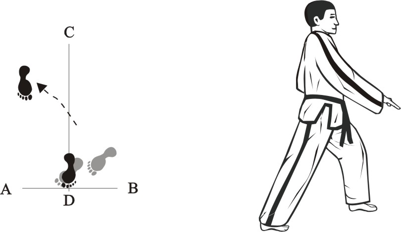Jump aside towards B, form a right jumping X-stance towards D and make a left sideward downward backfist-strike middle.