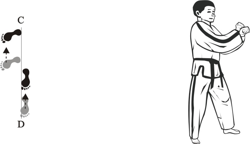 Step with the left foot back towards C and slide back towards C, form a left L-stance towards D and make a forearm guarding-block middle.