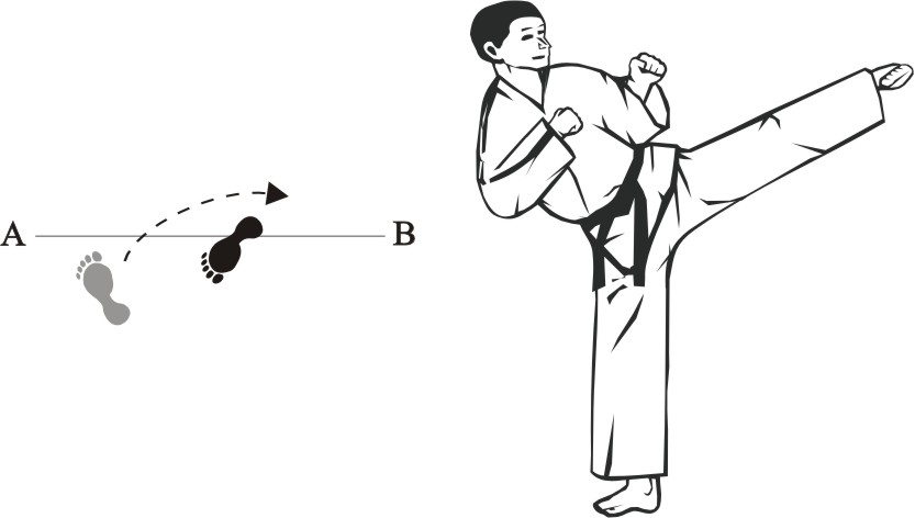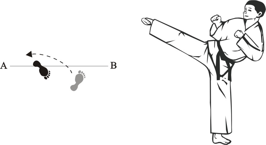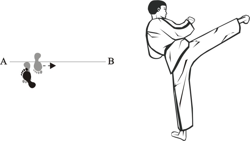 Place the left foot towards A, turn left on the left foot and make a right side-kick middle toward A.