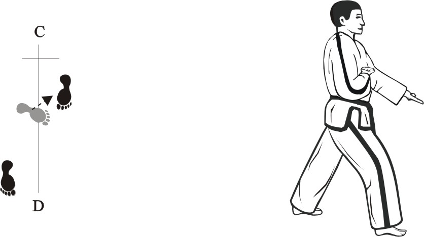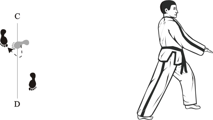 Turn right on the right foot and step back with the left foot towards C, form a right walking stance towards D and make a left outer knifehand-block low.