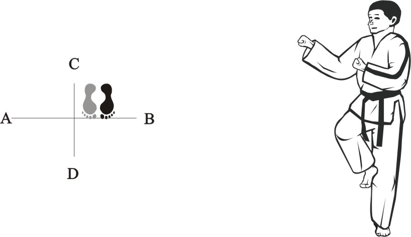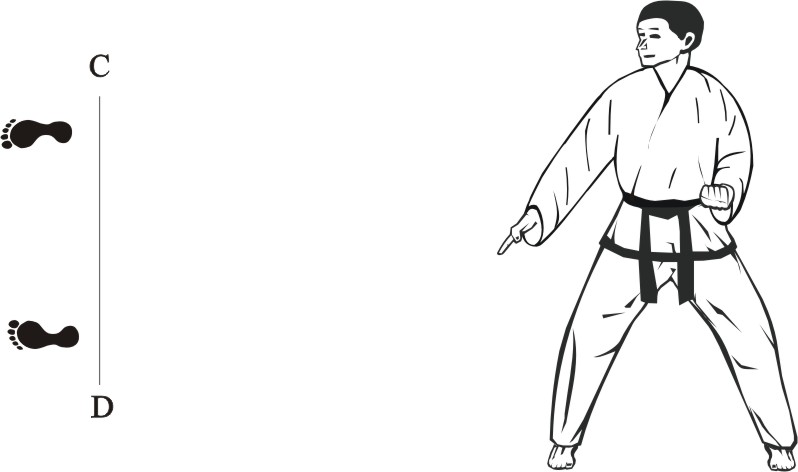 Turn right on the left foot and step the right foot back towards C, form a left walking stance towards D and make a right backward backfist-strike high and a left checking fist-punch middle.