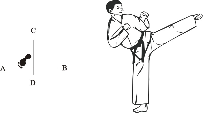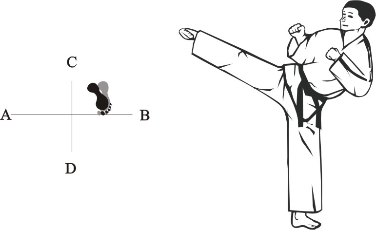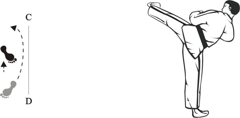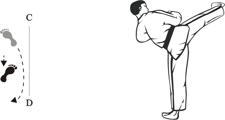 Step the left foot forward towards D and turn right on the left foot, make a right clockwise turned heel-kick high towards D.