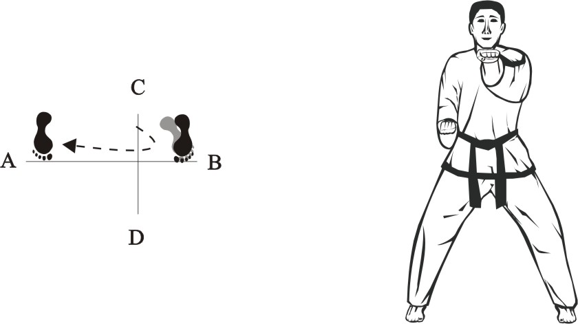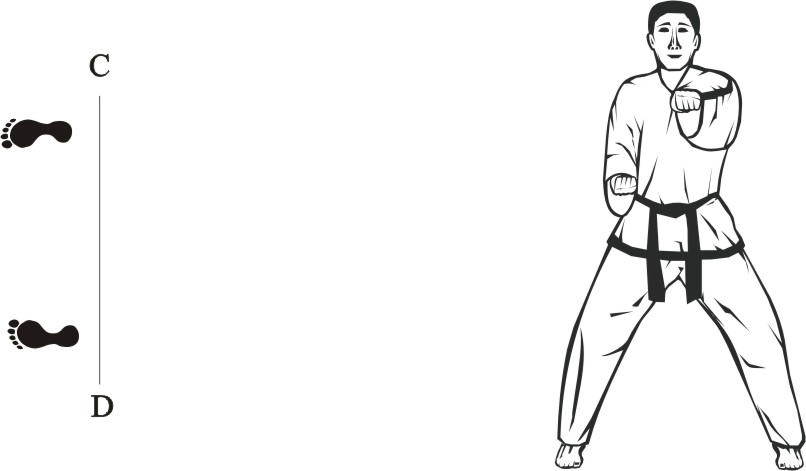 Bring the left foot next to the right foot and step with the right foot with a stamp sideways towards D, form a sitting stance towards A and make a left sideways outer fist-strike middle.
