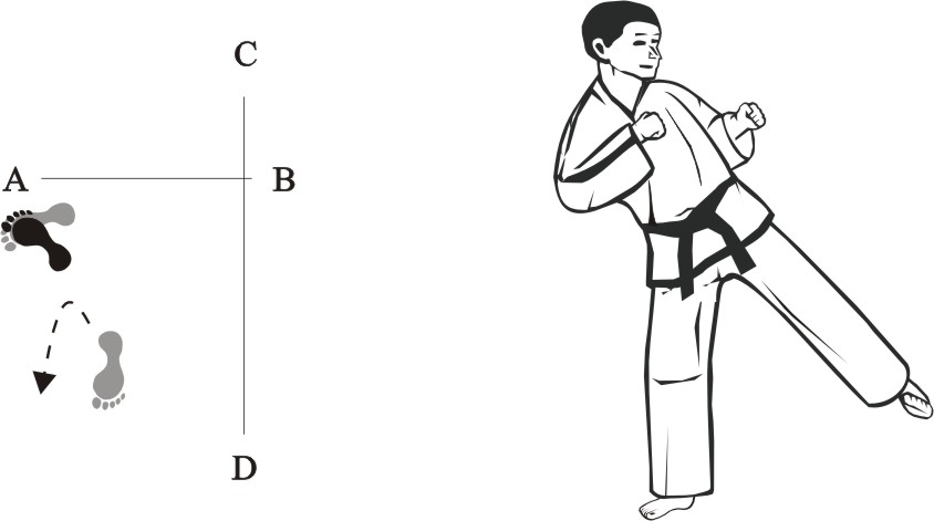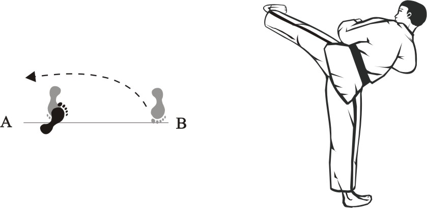 Turn right on the left foot and make a right clockwise hooking-kick high towards B.