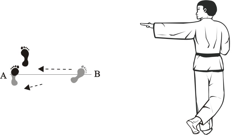 Bring the left foot next to the right foot and raise the right foot, form a left side bending-posture towards A.