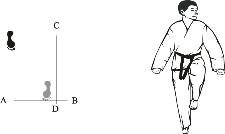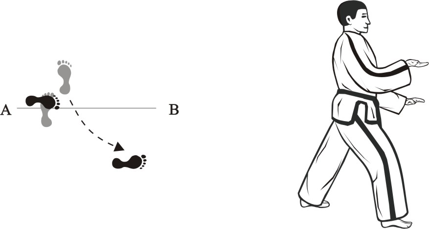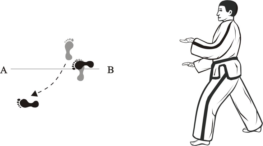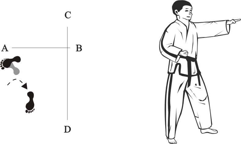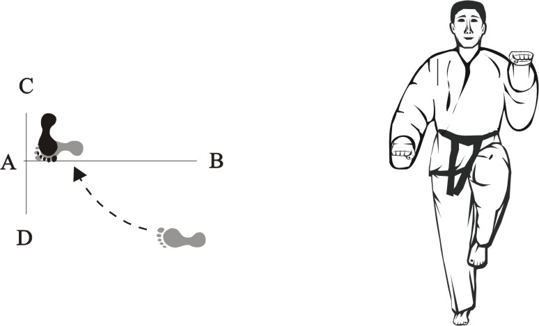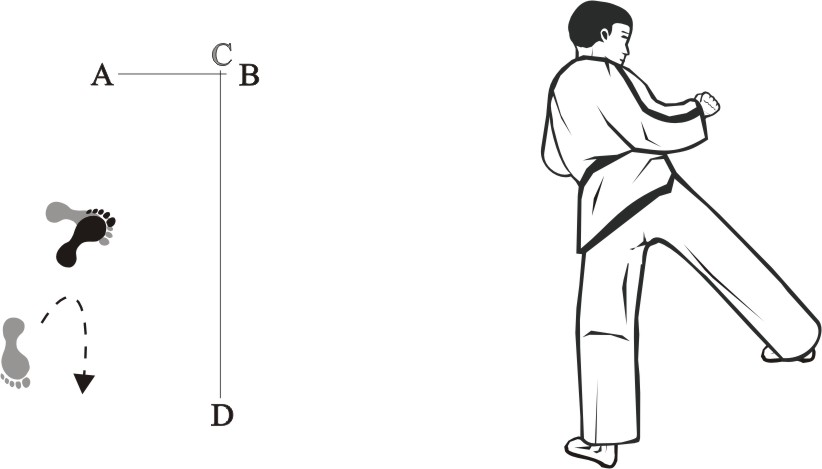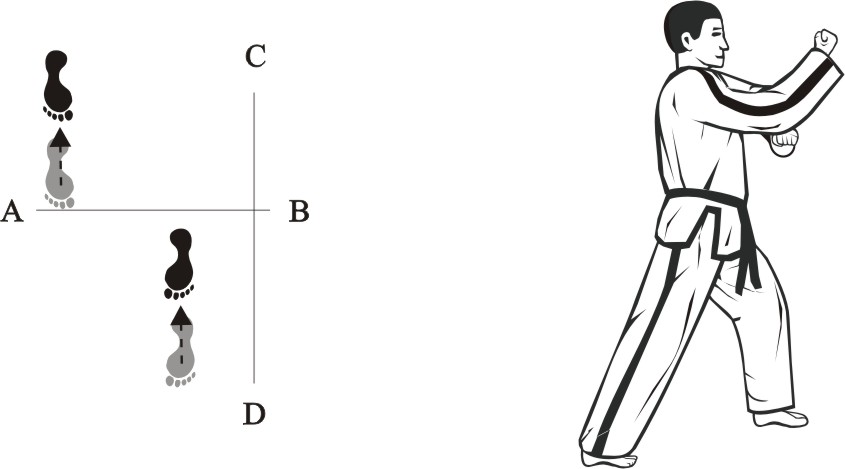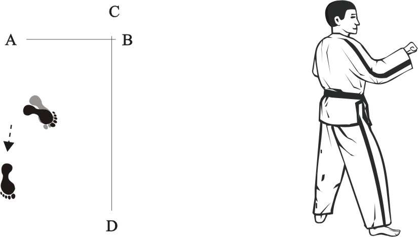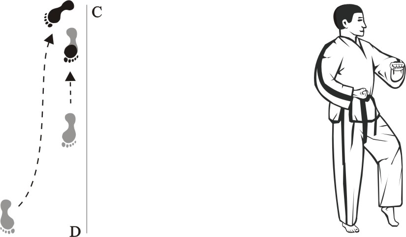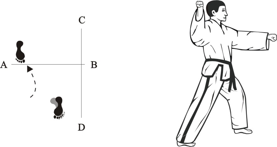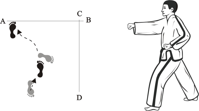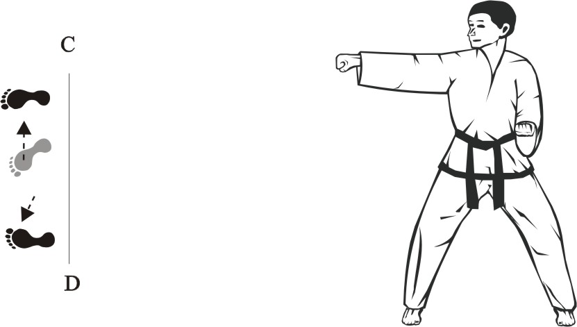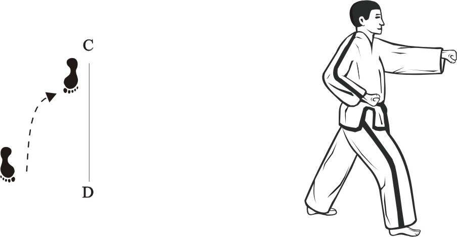 Jump forward towards C, form a rightjumping X-stance towards AC and make a left fist-punch low.