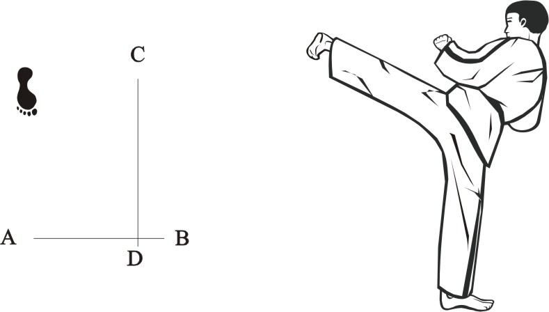 Step with the right foot forward towards D and make a left sideward twisting-kick high towards BD.