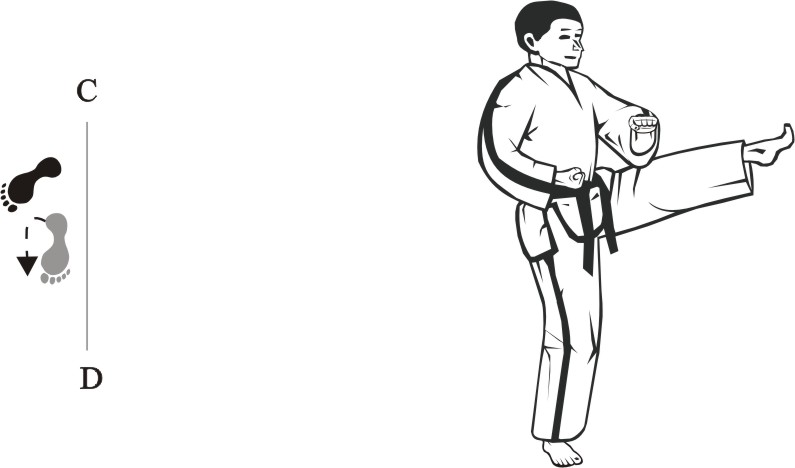 Turn right on the right foot and make a left checking side-kick downward towards D……