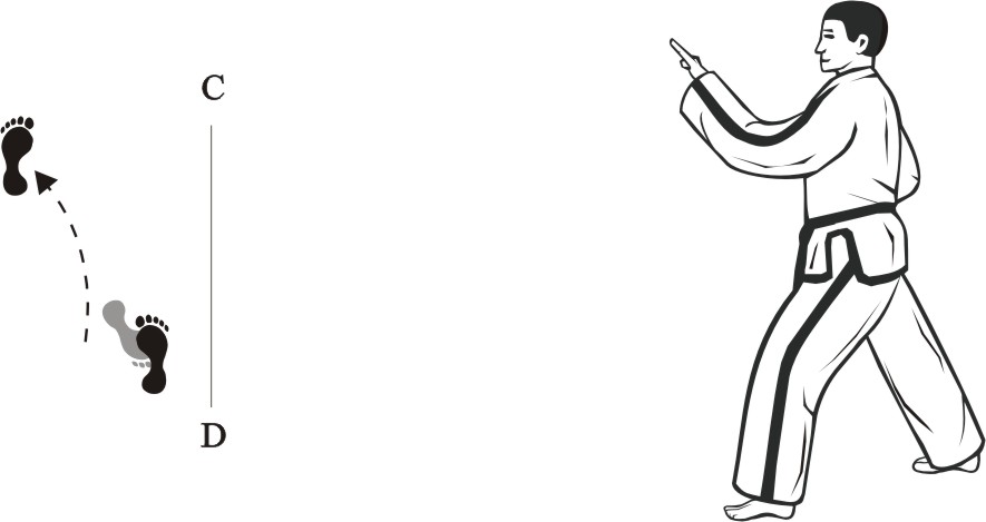 Place the right foot next to the left foot, turn left on the right foot, and step forward with the left foot towards C, form a left walking stance towards C and make a right fist-punch middle.