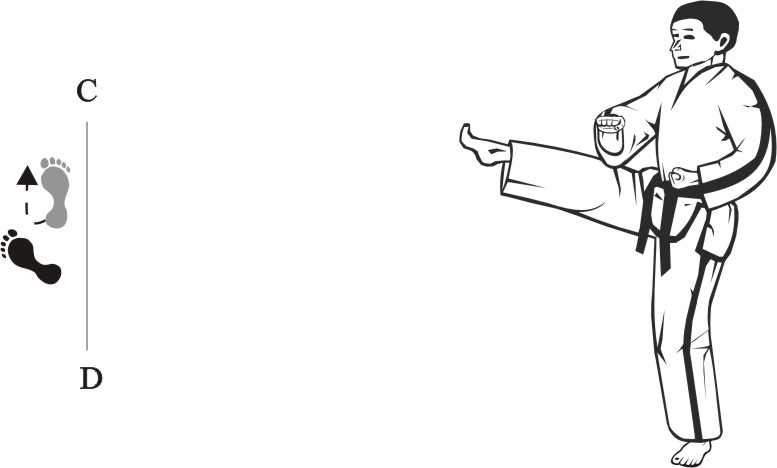 Place the right foot next to the left foot and make a left pushing side-kick middle towards D.