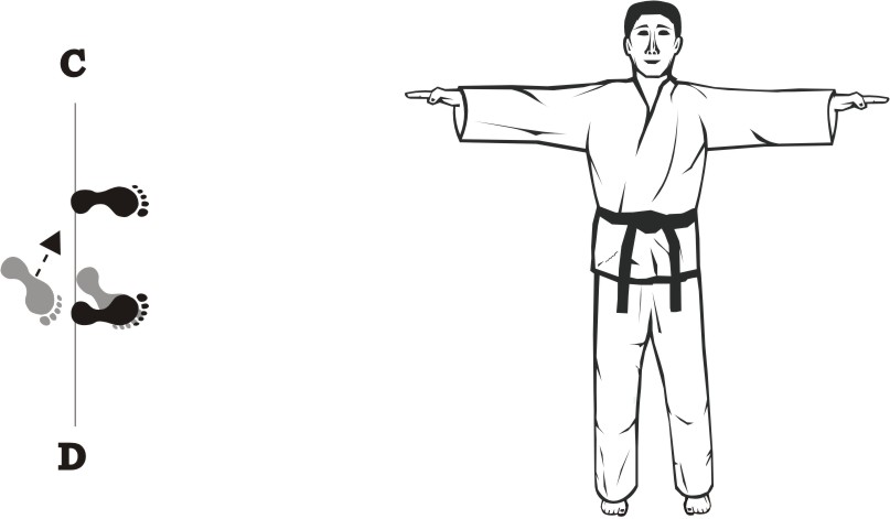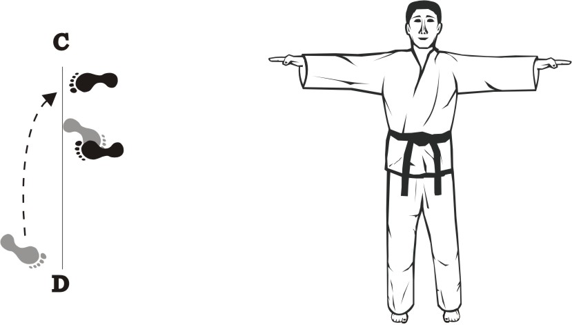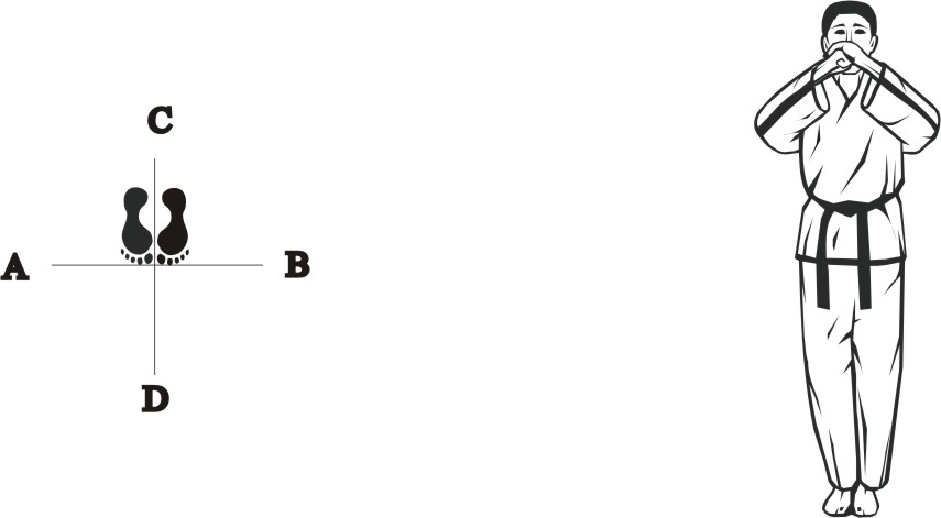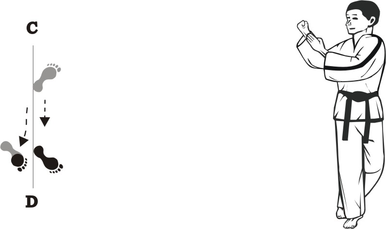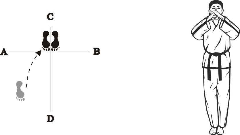 Place the right foot next to the left foot, form a closed stance towards D and assume the ready posture Chumby-A.