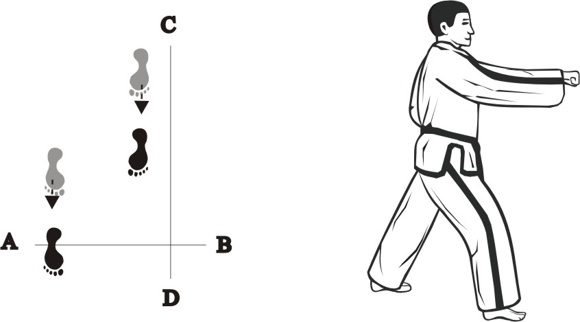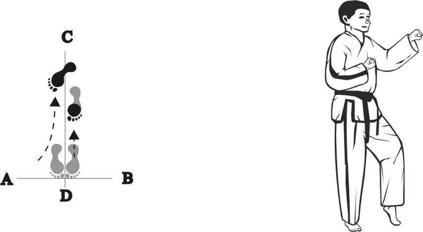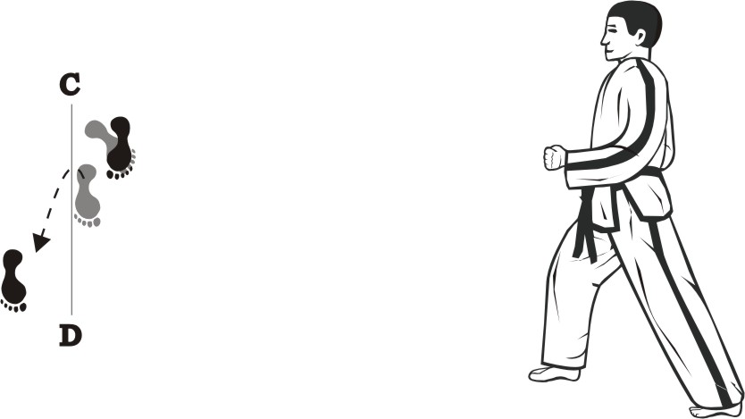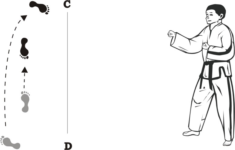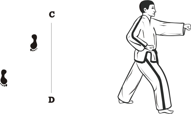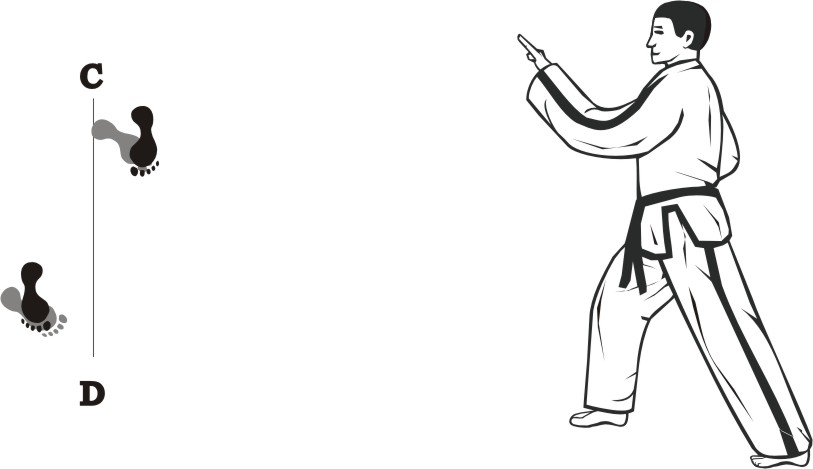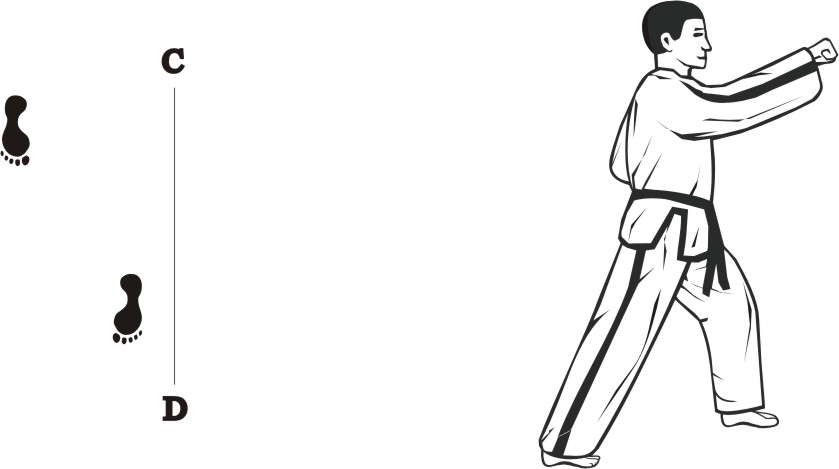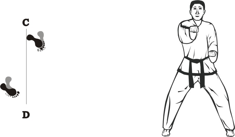 Slide forward towards D, form a left walking stance towards D and make a right fist-punch middle.