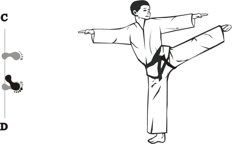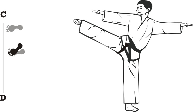 Turn right on the right foot and make a left turning-kick middle towards D.