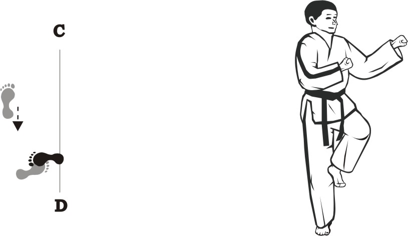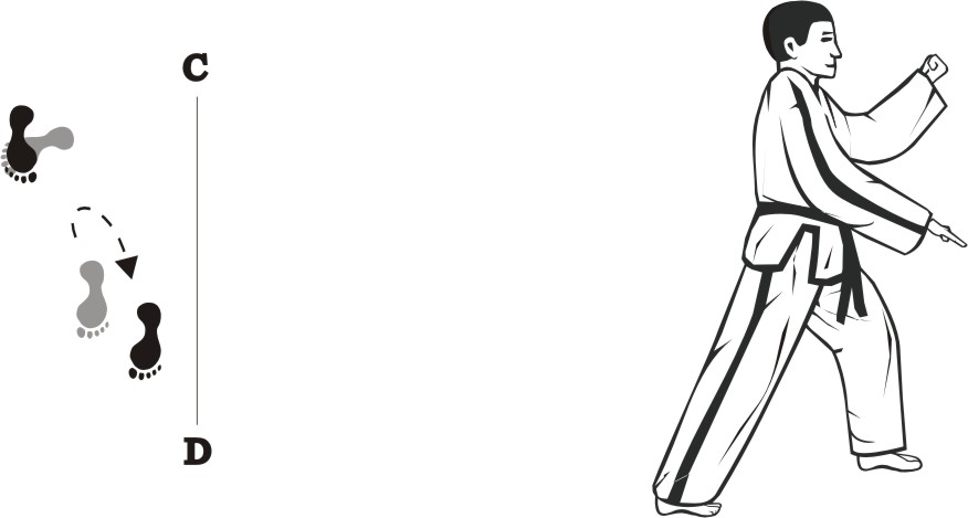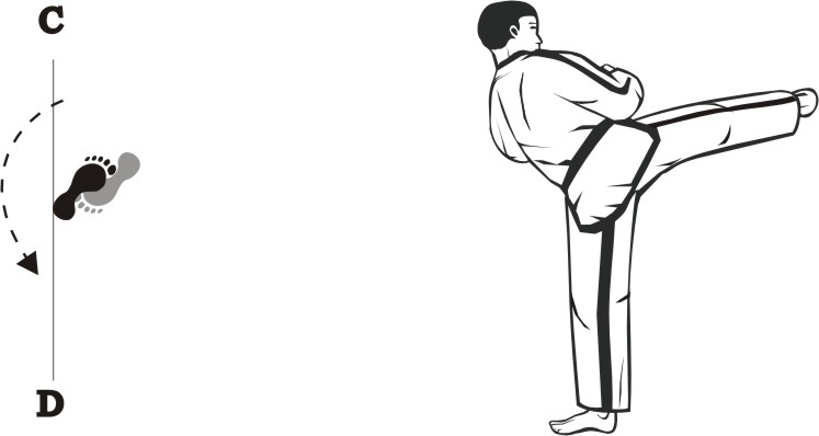 Turn right on the right foot and make a left front-kick low towards D.