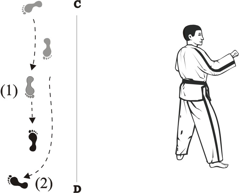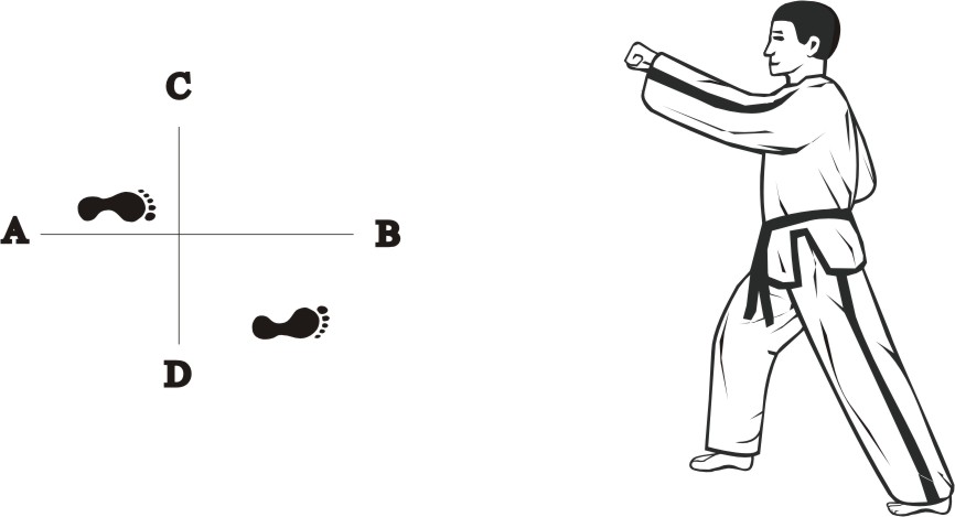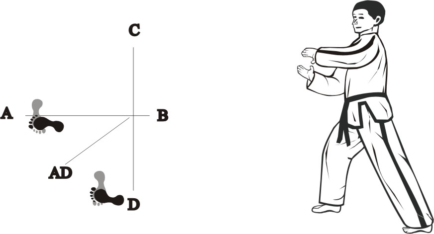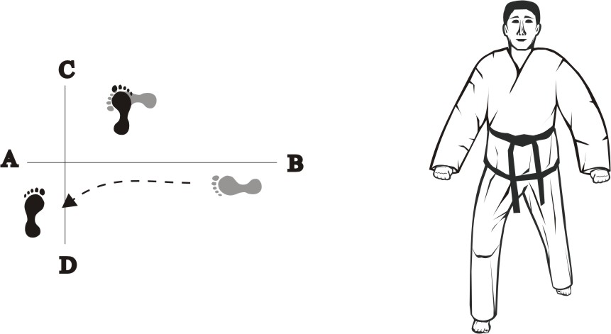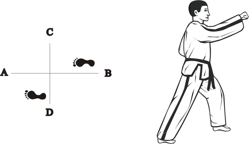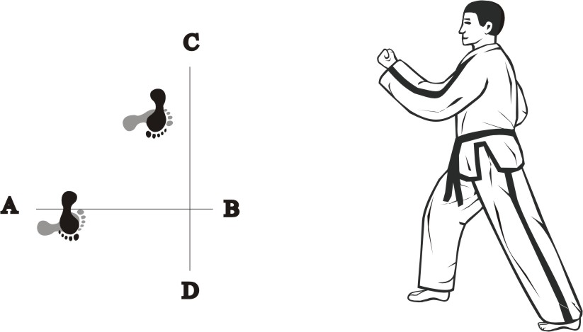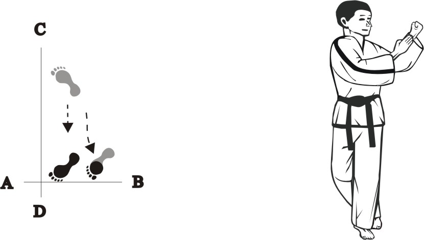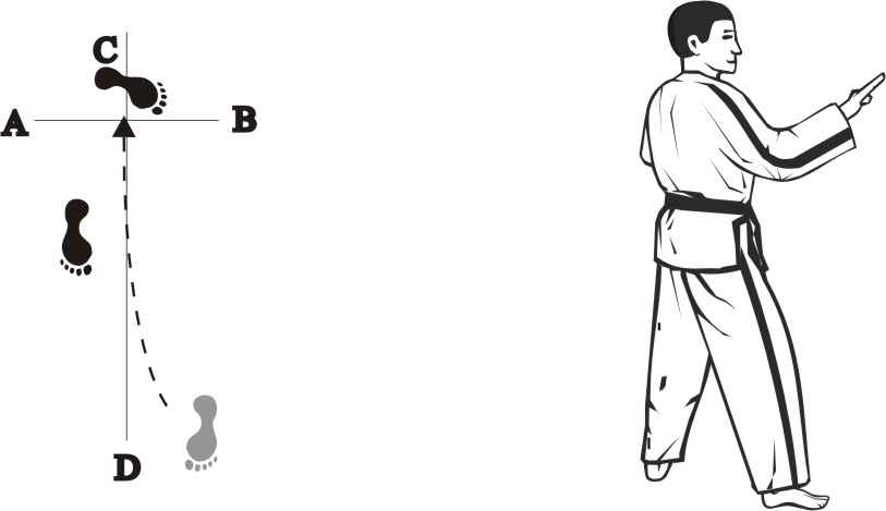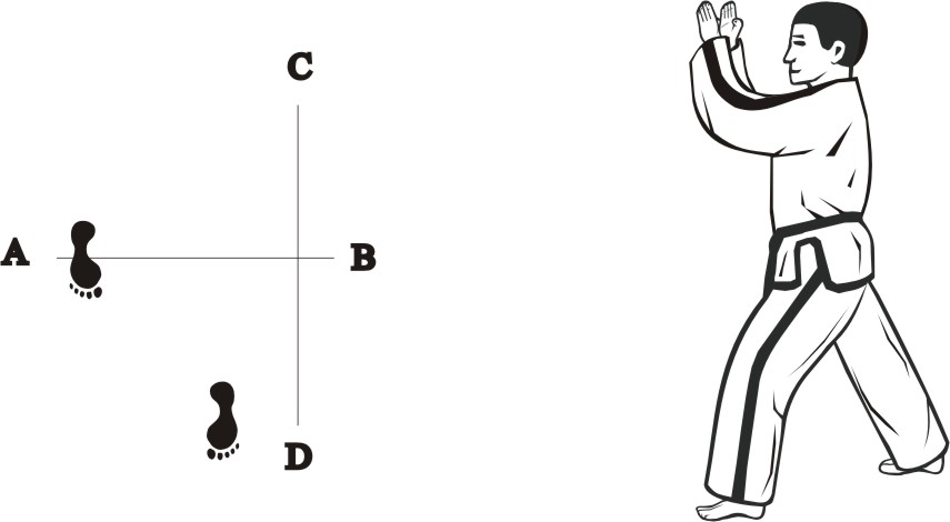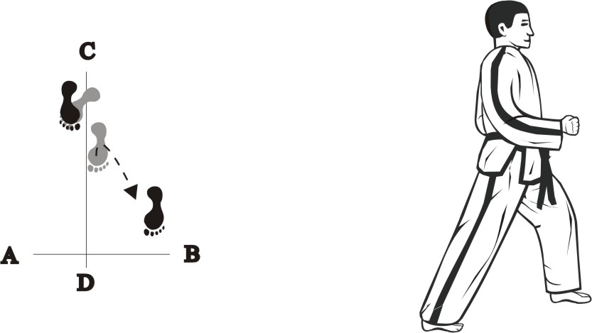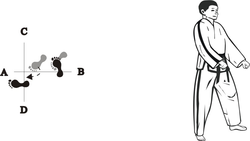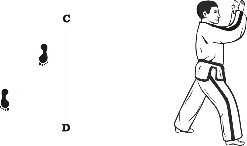 Step with the left foot forward towards D (1), turn left on the left foot, then step with the right foot back towards D (2) and then slide backward towards D, form a right L-stance towards C and make a knifehand guarding-block low.