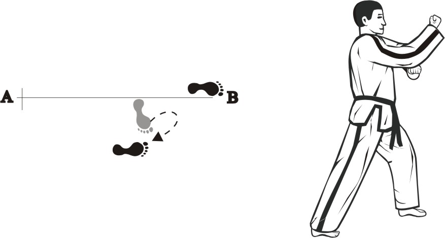 Pull the left foot back and step with the left foot backwards towards B, form a right walking stance towards A and make a left frontal backfist-strike high.