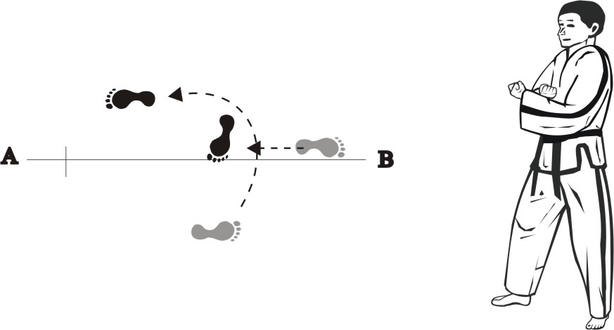 Turn left on the right foot and place the left foot next to the right foot, forming a parallel stance towards B and make a twin sideways outer knifehand-strike middle.