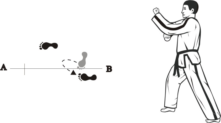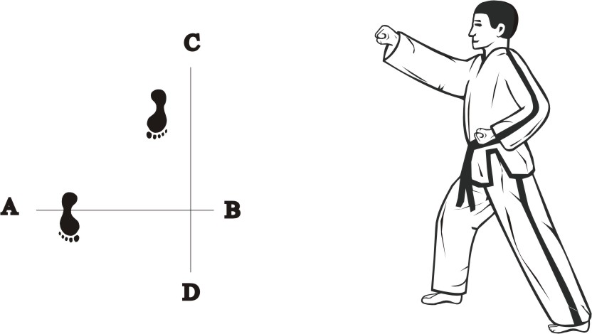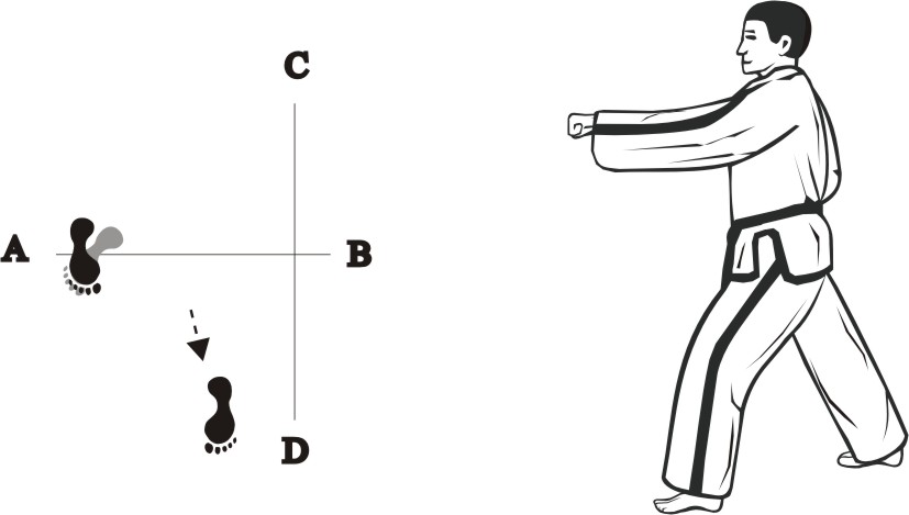 Turn left on both feet towards BD, form a sitting stance towards BD and make a right fist-punch middle.