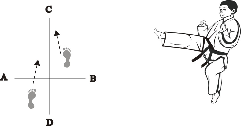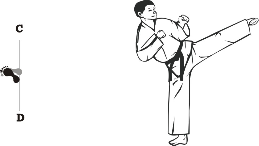 Turn left on the right foot and make a right front-kick low towards D.