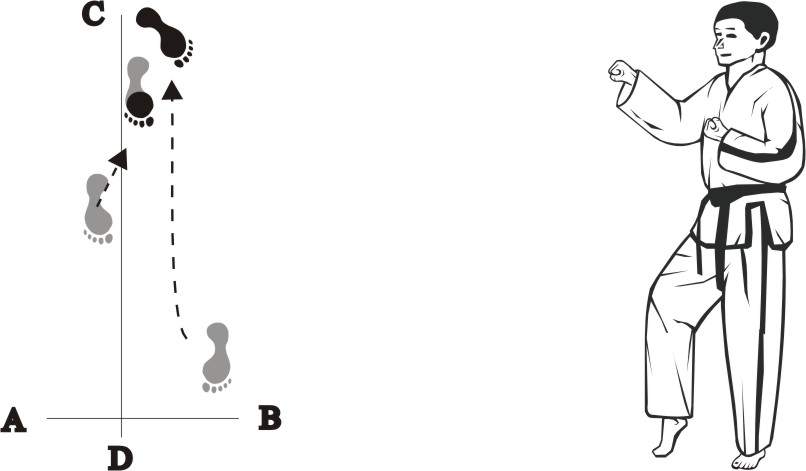 Jump forward towards D, form a right jumping X-stance towards BD and make a right sidewards backfist-strike high.