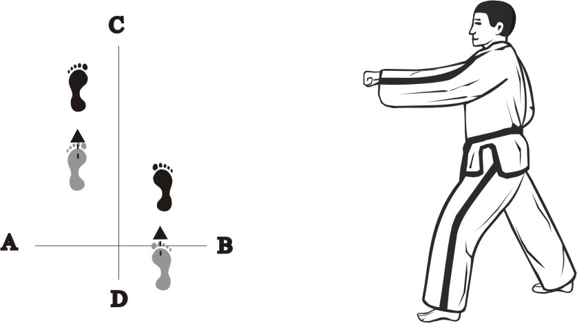 Place the left foot to the side towards C and bring the right foot back, form a left L-stance towards B and make twin fist-punch low.