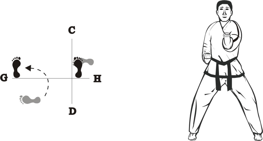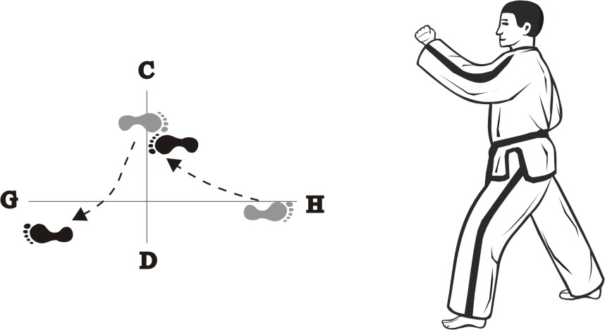 Place the right foot to the side towards D and move the left foot forward, form a right fixed-stance towards H and make a forearm guarding-block high.