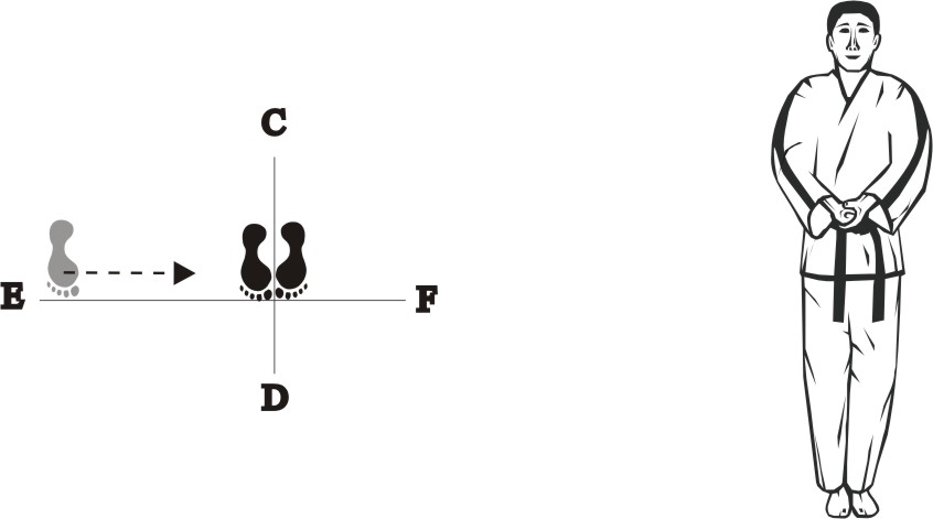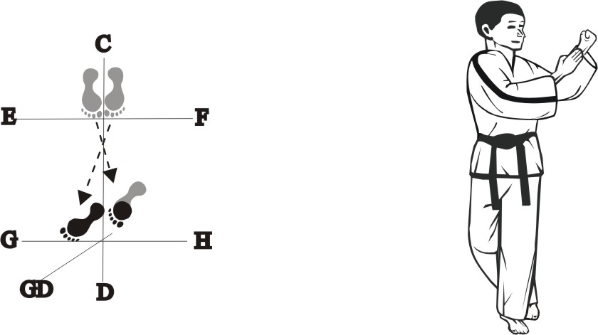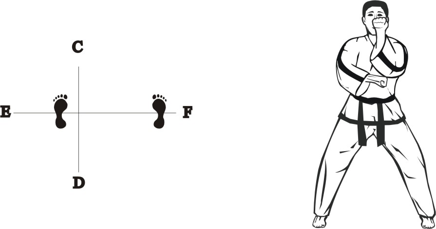 Bring the left foot next to the right foot and step with the right foot sideways towards E, form a sitting stance towards D, and make a right sideways outer knifehand-strike middle.