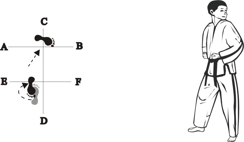 Turn to the right on the left foot and step with the right foot sideways towards F, form a sitting stance towards C and make a right checking fist-punch middle.