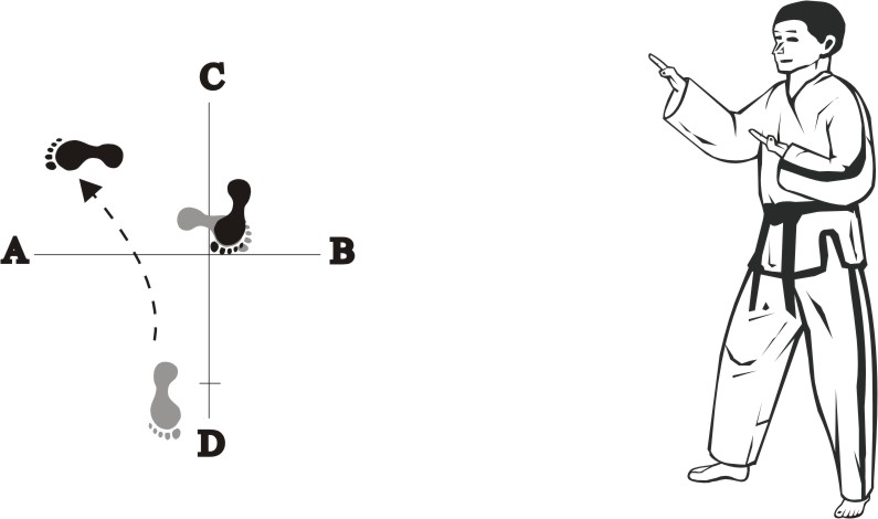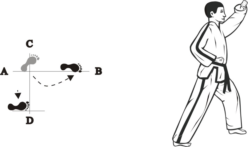 Place the right foot next to the left foot and step forward with the left foot towards B, form a left walking stance towards B and make a left outer forearm-block upward.