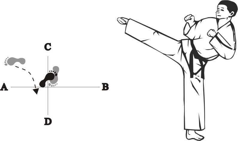 Turn to the right on your right foot and make a left turning-kick middle towards C.