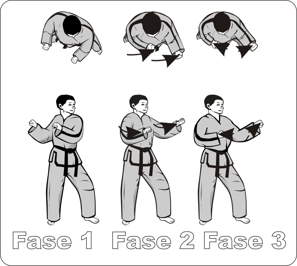 In a defensive block, one hand performs the technique while the counter-movement goes towards the middle of the chest. In the Tuls, This block has two executions, with knife hands and with fists. The front hand can serve as a block at low, middle, or high level, with contact on the inside or outside of the hand. The rear hand provides the counter-movement. Both hands are either open or closed.