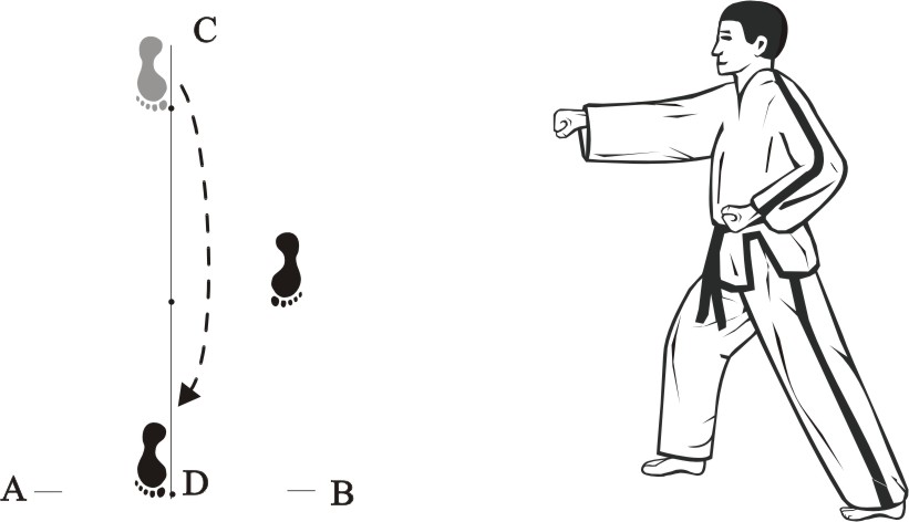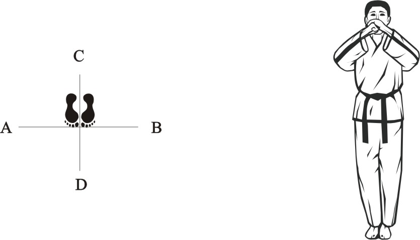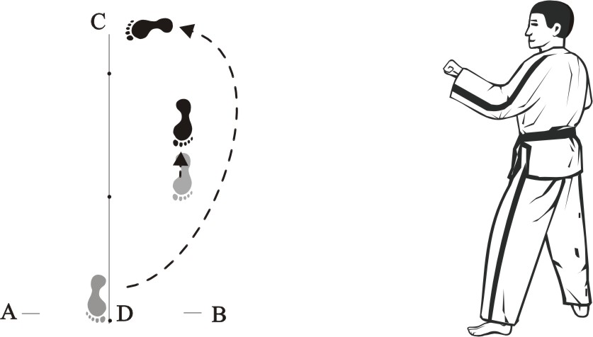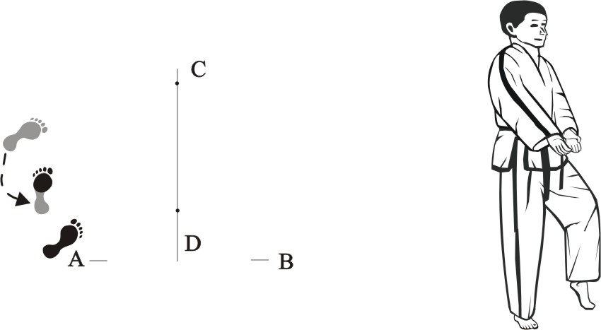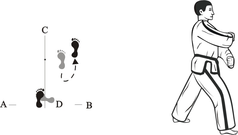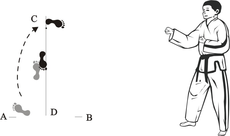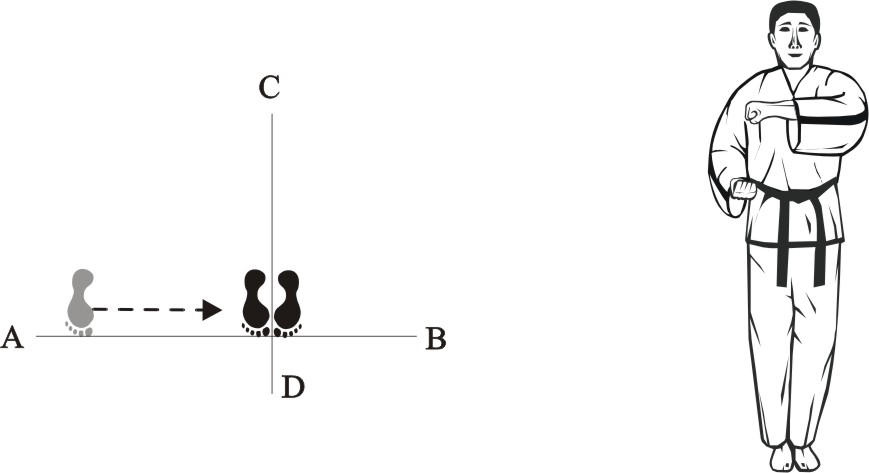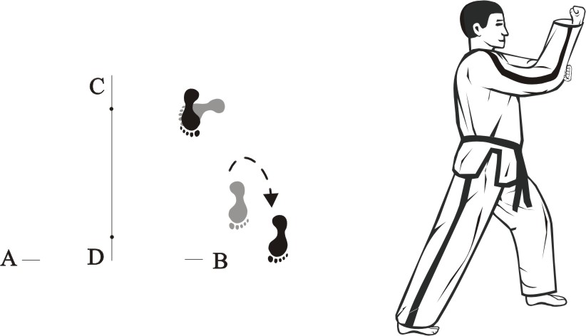 Turn left on the right foot and bring the left foot next to the right foot to form a closed stance towards D, then assume the ready posture Chumby-A.