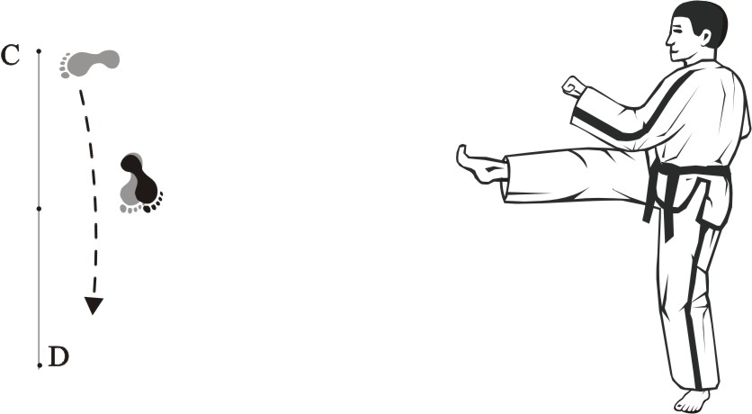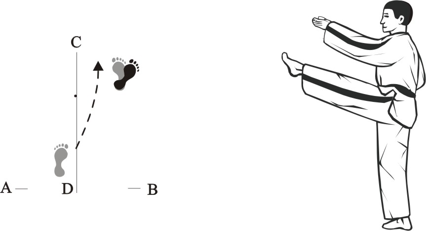 Turn left on the left foot and make a right front-kick low towards D.
